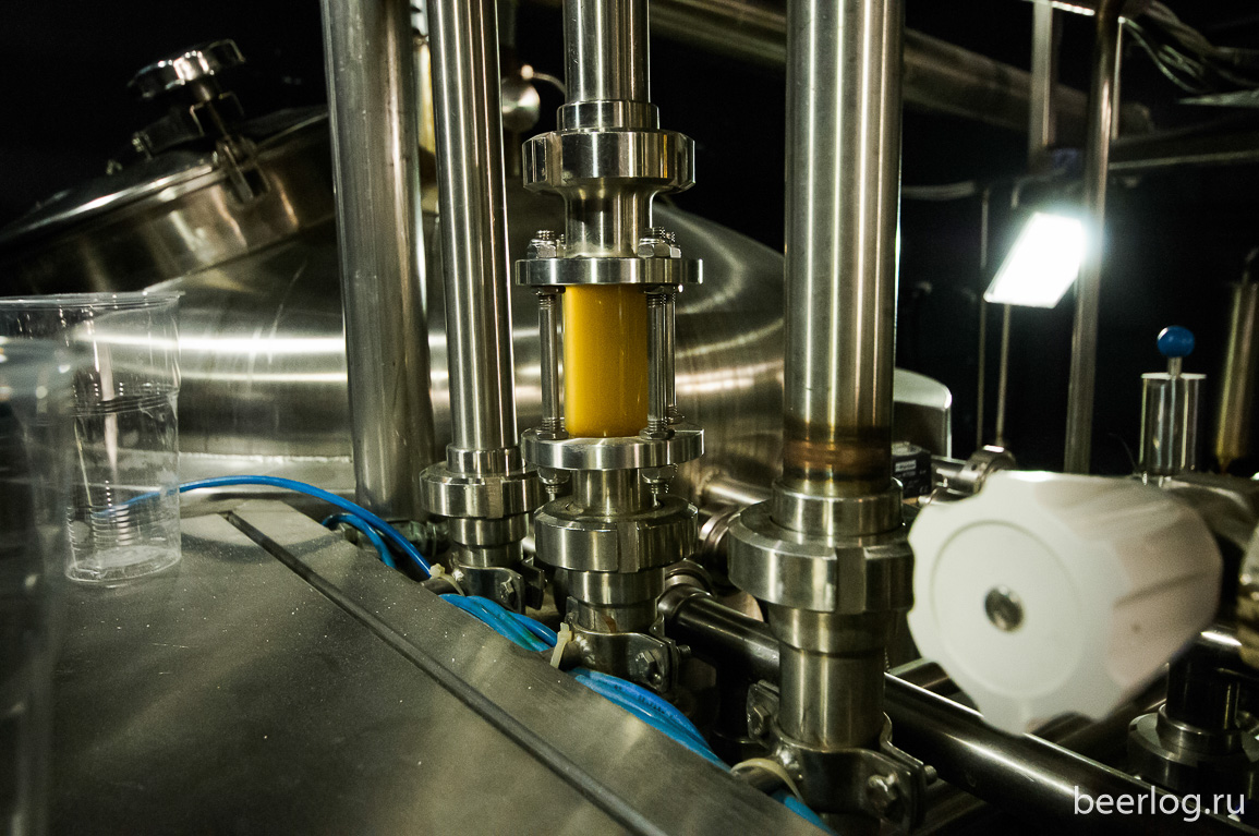 Тем не менее, варку удалось завершить, в самом конце внесли еще гвоздику и вторую часть кориандра. Опять-таки с большими нагрузками для насоса перекачали сусло в вирпул, начальная плотность составила 11,5%, как и было запланировано в соответствии с рецептом.
