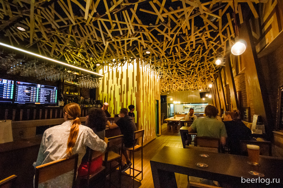 Внутри обнаруживается строгий угловатый интерьер с креативным трехмерным потолком из досок, 30 кранов и внушительное количество бутылок: