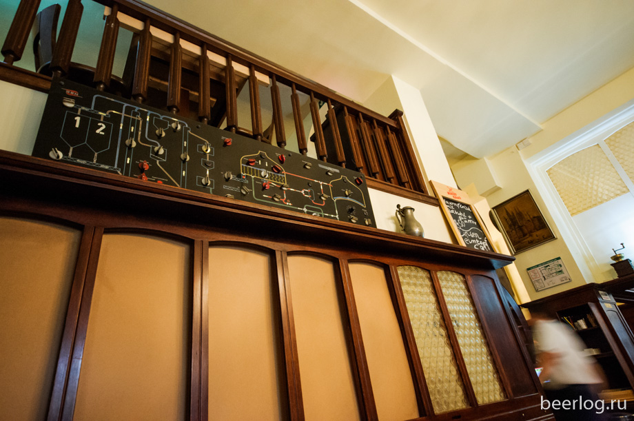 Стена украшена старым пультом управления для варочного оборудования: