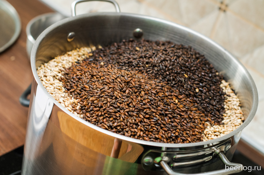 Решил я сварить какой-нибудь плотный портер, поскольку одни и те же дрожжи — WLP007 Dry English Ale — у меня были запланированы на две варки подряд (первой был американский янтарный эль на Мозаике). Сам производитель заявляет, что этот штамм отлично подходит для стилей Foreign Style Stout и Imperial Stout — вот в этом направлении и будем копать ;) Выбрал в качестве базовых солодов Pale Ale, Munich II и немного немецкого копченого — около 15% от засыпи. Специальные солода — Caraaroma, Crystal, Black и Chocolate: