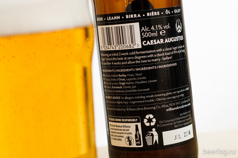 Как-то заприметил я на полке одного магазина новое пиво от шотландской пивоварни Williams Bros (которую весьма уважаю). На этикетке сразу же под названием было указано, что это гибрид лагера и IPA, что, в сущности, и привлекло мое внимание в первую очередь. Сзади, на контрэтикетке, обнаруживается лаконичное пояснение, из которого ясно, что это классический лагер, сброженный лагерными дрожжами при низких температурах, после чего подвергшийся лагерированию в течение четырех недель, но с сухим охмелением сортами хмеля, обычно используемыми в айпиэях. Что это были за сорта, контрэтикетка не проясняет, но вот на сайте производителя они с легкостью обнаруживаются: это Nelson Sauvin, Amarillo, Styrian и Cascade.